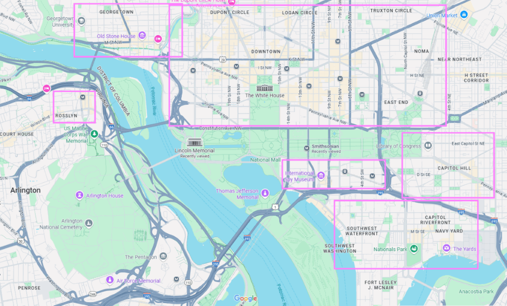 ワシントンDCは車がないほうが身軽に観光できるので、交通の便が良く自分が行きたい観光スポットに近いエリアを選ぶことで効率よく楽しめます。一番おすすめはナショナルモールの北側、フォギーボトムやダウンタウン、それからデュポンサークルです。安く済ませたいならポトマック川対岸のロスリンなどメトロで移動しなくてはならない場所も駅近ならありです。